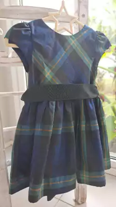 Vestido de fiesta escocés verde y azul con cinto negro. POLO. Talle 18 meses