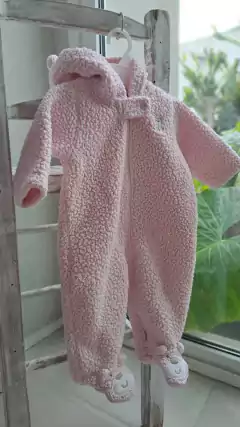 OUTLET - Enterito rosa de algodón, corderito, capucha y pies de osito. CARTERS. Talle 3 meses