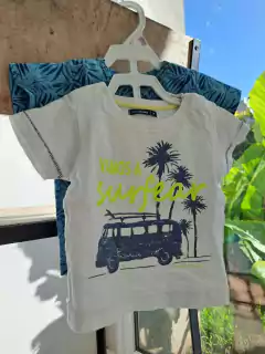Set: 2 remeras MC blanca c palmeras azules + celeste c hojas azules - MIMO - Talle M (6a9 meses)