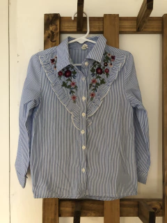 Camisa ML a rayas celeste con flores bordadas. Young Dimension. 4/5 años.