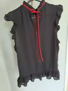 Camisa SM negra c cinta roja al cuello. Volados en hombros - CUESTA BLANCA - Talle 46 (M)