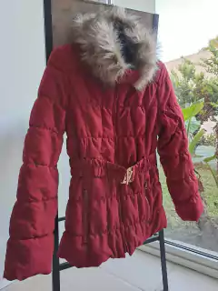 - Inicio / Adultos / Small y medium / Talle S | Campera entallada rojo tomate, cuello de piel y cinturón elástico con hebilla dorada- C' EST TOI - Talle S