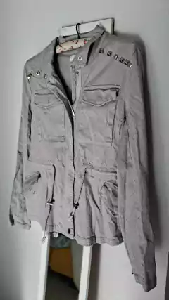 Chaqueta gris c/brillo, tachas y cierres. MOTIVI. Talle S