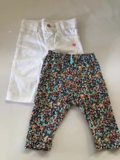 Dos pantalones: jean blanco finito con corazón y pantalón de algodón con flores. CHEEKY y MIMO. 3 meses. El jean tiene elástico.
