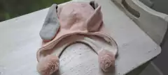 Gorro de lana rosa y gris, con polar adentro. Oreja de conejo y pompón, tcubre orejas.Dice talle Unico pero será para 2-3 años