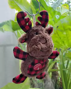 Juguete, peluche de reno, marrón c detalles cuadrille rojo y negro