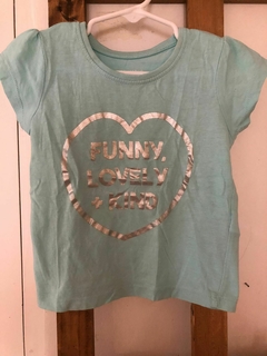 Remera MC celeste con corazón plateado. PRIMARK. 18 meses.