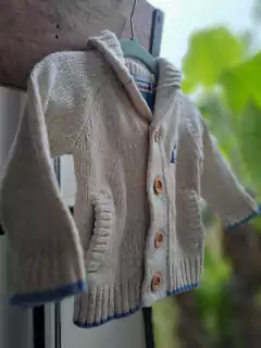 Sweater beige c botones grandes, linea azul en puño - OPALINE - Talle 6 meses