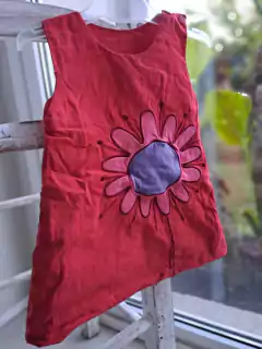 Vestido SM rojo c aplique de flor bordada em azul y rosa - OWOKO - Talle 2 de Owoko es 6 meses.